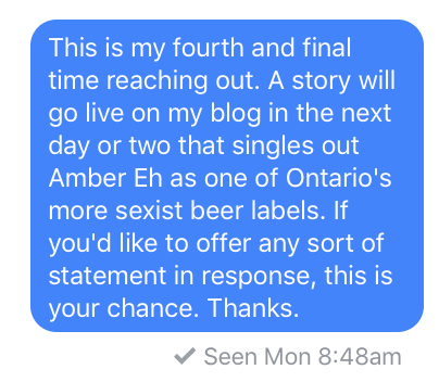And obviously Christopher using “it’s a boob joke” as a defence for one of Whitewater’s sexist beer names really sucks (I pointed out that it was a dumb boob joke in my inquiry to show it was defenceless and he agreed it was a dumb boob joke AS HIS DEFENCE. That’s some Donald Trump press secretary level spin right there).